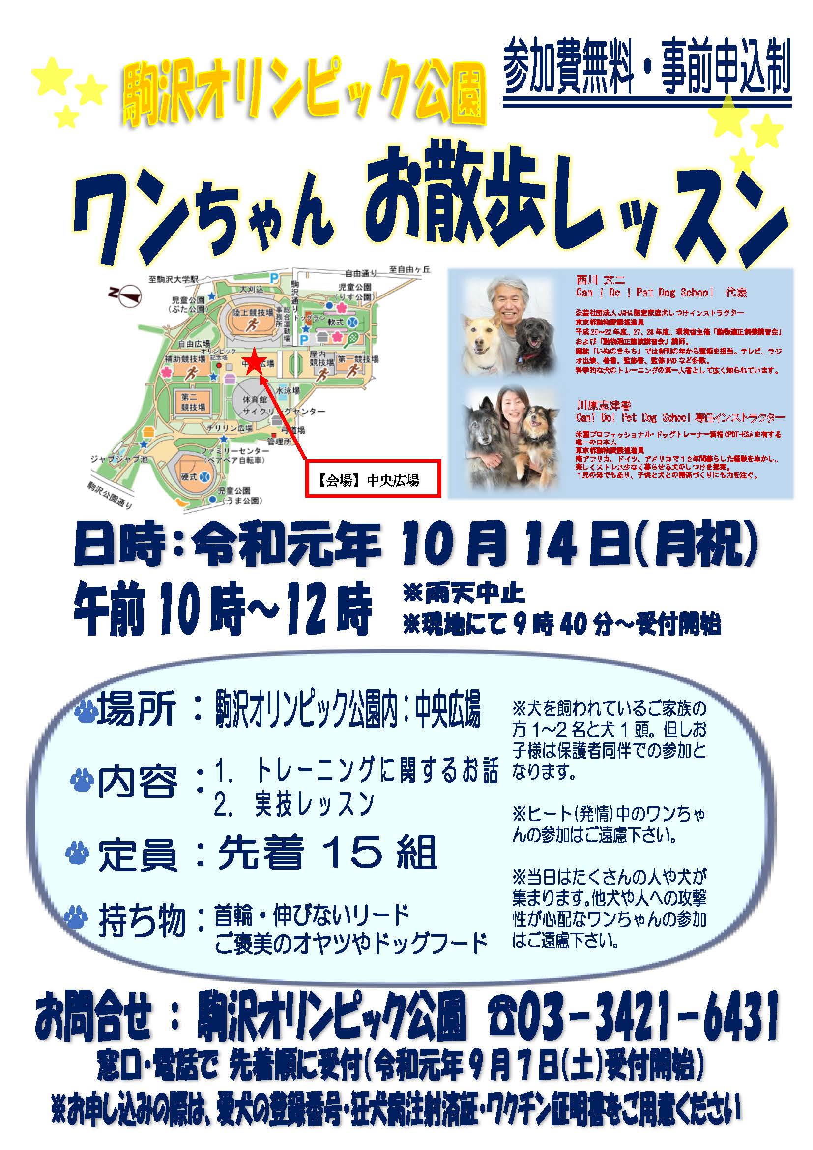 ワンちゃんお散歩レッスン2019-09-032019-09-04 カレンダー 日時: 2019-10-14 @ 10:00 – 12:00 2019-10-14T10:00:00+09:00 2019-10-14T12:00:00+09:00 場所: 中央広場 お問い合わせ: 駒沢オリンピック公園 03-3421-6431 イベントのサイト イベント 窓口・電話で先着順に受付(令和元年9月7日(土)受付開始) ※犬を飼われているご家族の方1~2名と犬1頭。但しお子様は保護者同伴での参加となります。 . Posted by たか