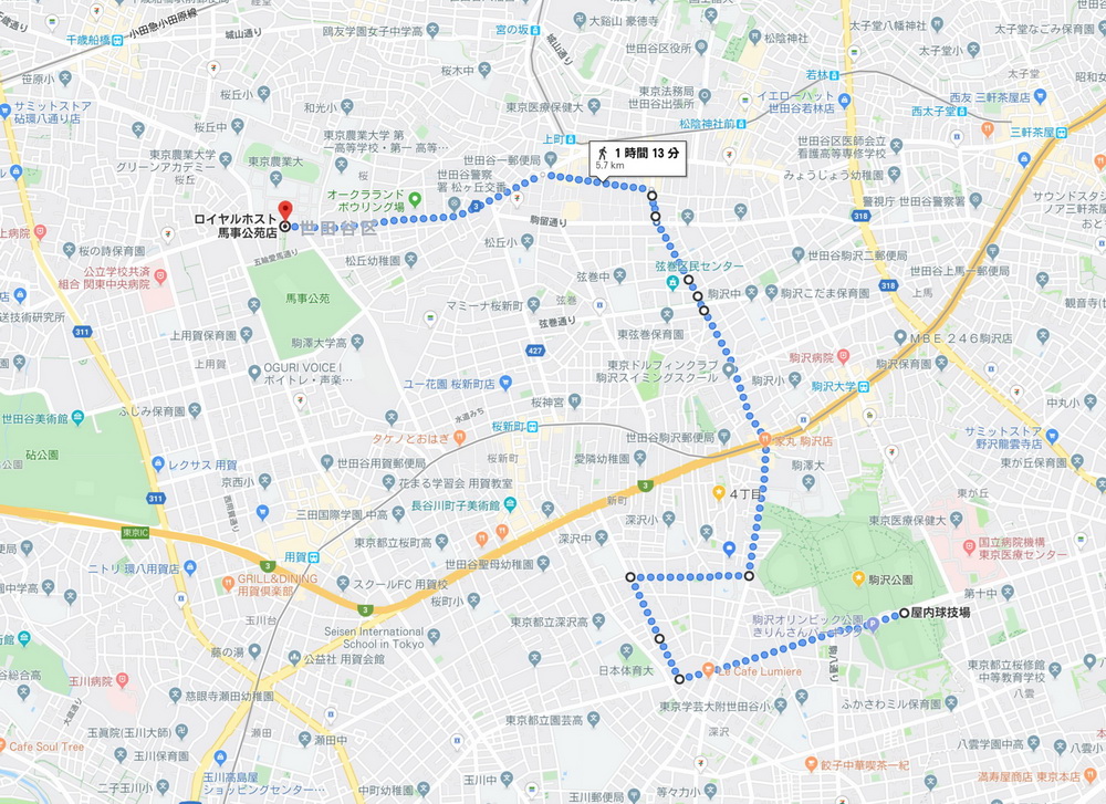 私の予測したコース地図 駒沢公園~馬事公苑 5.7km 徒歩1時間13分