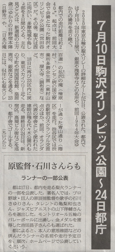 聖火リレーのルート決定、2020年7月10日駒沢公園スタート
