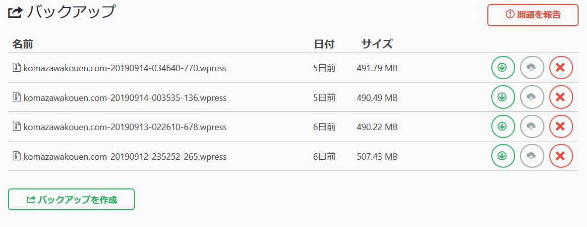 バックアップファイルが作られ、作成日時とファイルサイズが表示されます。
