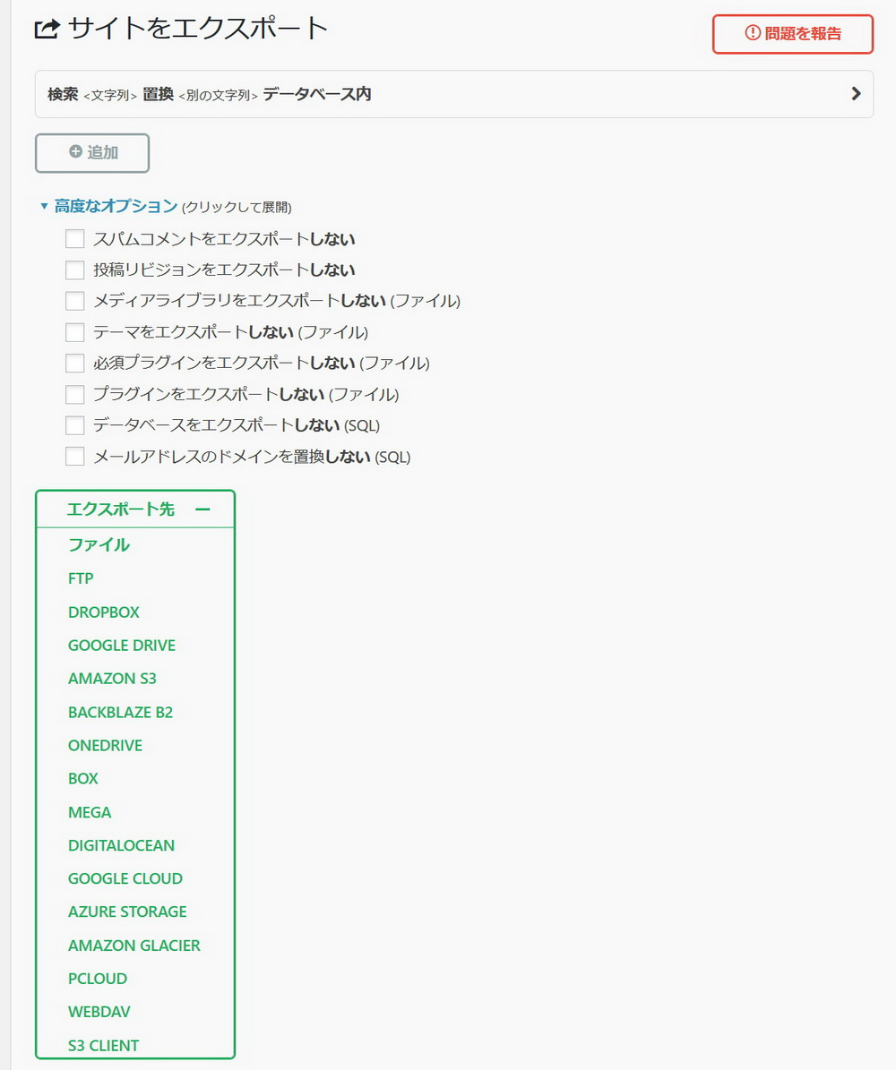 文字列の検索と置換、エクスポートしないファイルを選択することができますが、必要がなければ Webサイトを構成するファイル一式をまるごとエクスポートします。
