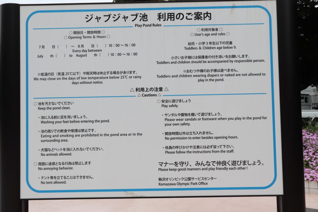 仕方がないので、管理事務所に聞きに行ったところ事務所のおばさんが、ジャブジャブ池のオープンは、7/13(土)~9/1(日)だと教えてくれました。