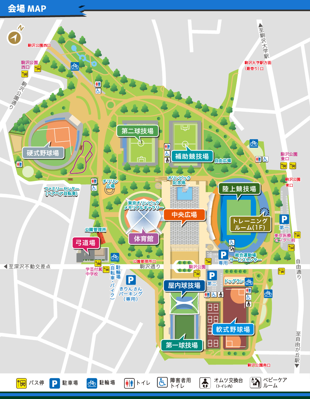 東急田園都市線「駒沢大学駅」下車、「公園口」の出口を出て、自由通りを南へ直進、「駒沢公園東口」から入場する場合